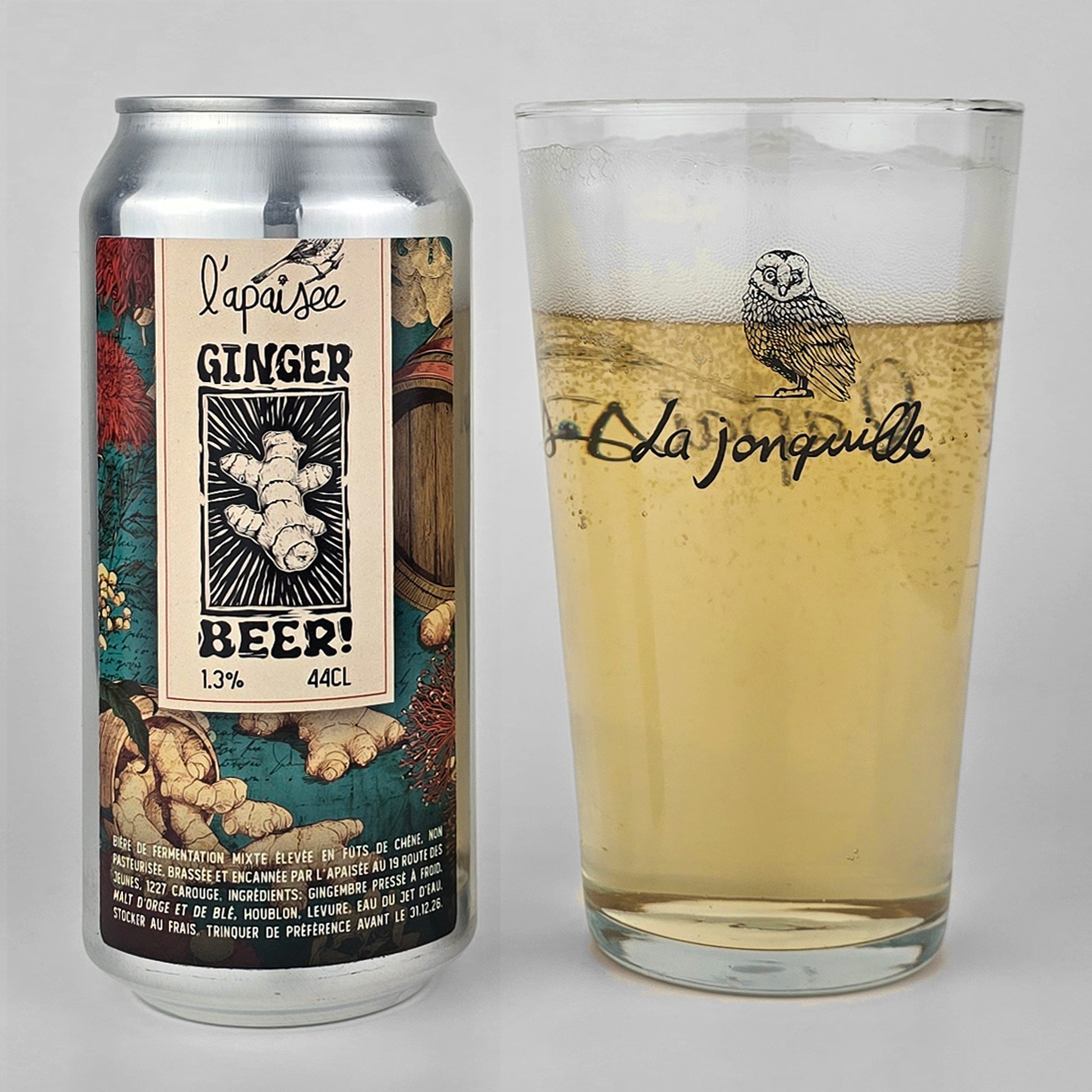 De la bière de fermentation mixte élevée deux ans en fûts de chêne, de l’eau du jet d’eau et du gingembre fraîchement pressé à la brasserie. Pas de sucre, pas de pasteurisation, pas de filtration. Cette bière à 1.3% d’alcool légèrement acidulée se boit toute seule en pinte et fait grave plaisir !